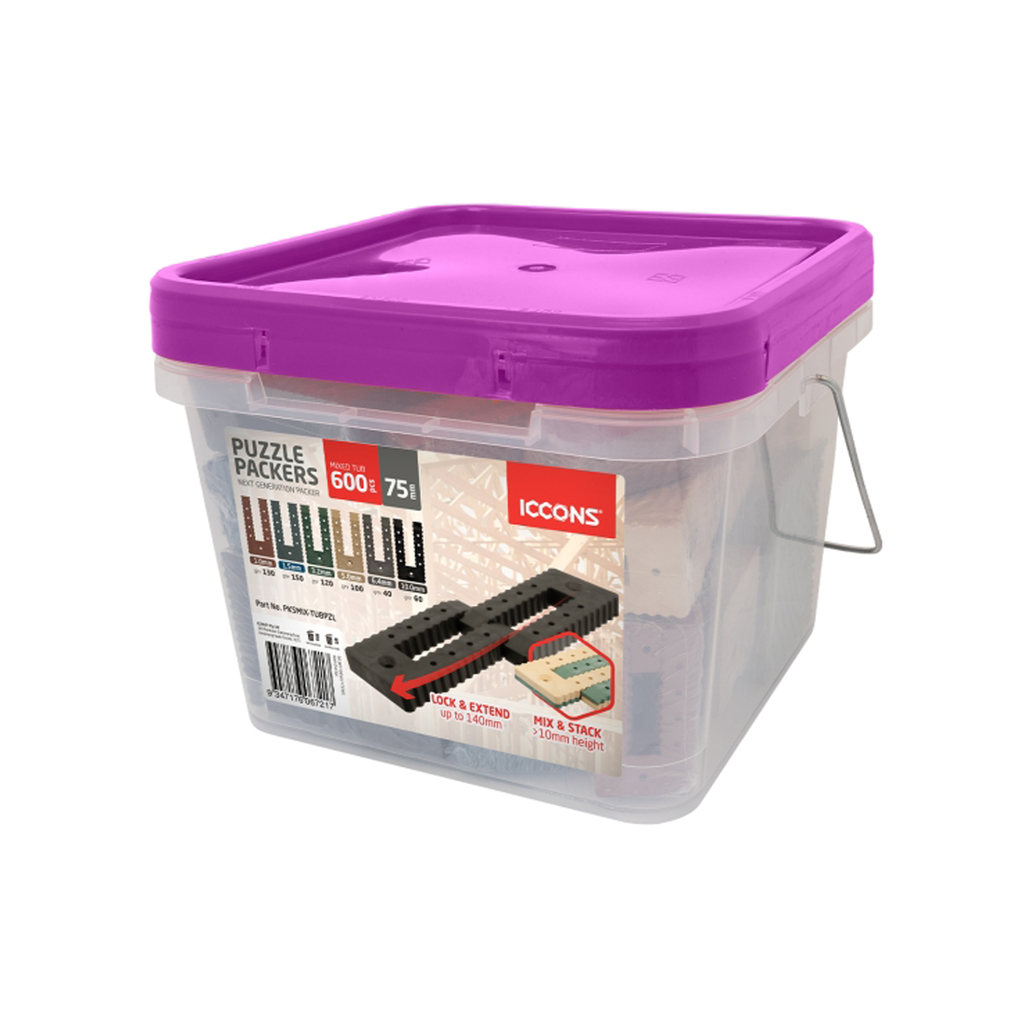 With ICCONS’ patented LOCK & EXTEND and MIX & STACK interlocking design, Puzzle Packers are changing the way packers are used on site. Forget multiple tubs of 75mm, 90mm, and 140mm lengths, Puzzle Packers lock together seamlessly, delivering the exact length you need, when you need it. Each tub includes six different colour coded height options from 1.0mm to 10.0mm, giving you full flexibility on site and achieving heights that traditional packers simply can’t match.